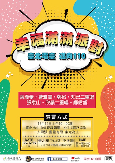 2020的臺灣,有溫暖、有傷感,在您的心中,是否有一首主題曲能體現此刻的心情旋律呢?臺北廣播電臺12月19日(六)將於臺北市中山堂中正廳一連舉辦兩場「邁向110-幸福滿滿派對」活動,特別邀請金嗓歌后葉璦菱、美聲實力唱將鄭怡、金曲最佳台語女歌手曹雅雯、民歌經典組合知己二重唱、森林王子張泰山等重量級歌手,與民眾一起追憶屬於你我的流行音樂風華、共同迎向美好的2021。