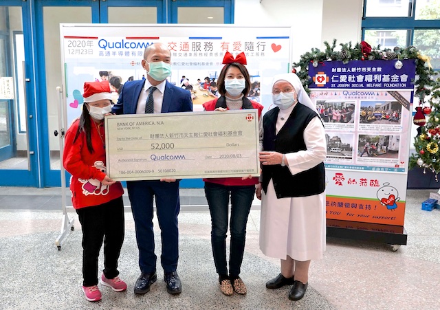 新竹市天主教仁愛基金會於12/23日上午舉辦「交通服務,有愛隨行—高通半導體有限公司捐贈交通服務費感恩記者會及志工服務活動」,感謝高通公司贊助交通服務費美金52,000元(新台幣1,523,080元),幫助居住偏遠地區或需要接送的80位智能障礙朋友,平日搭乘交通車到仁愛基金會附設晨曦發展中心接受日間服務。