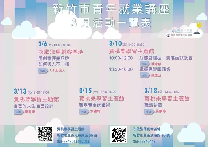 勞動部勞動力發展署桃竹苗分署長賴家仁表示,為促進青年就業,3月份賈桃樂主題學習館陸續推出了求職必勝密技及專業技能等課程,衣啟飛翔創客基地也推出「用創意經營品牌,如何與人不一樣?」,邀請前奧美互動行銷副總的CJ王俊人,可以讓青年朋友快速上手許多社群行銷密技,歡迎竹市青年朋友報名參加。