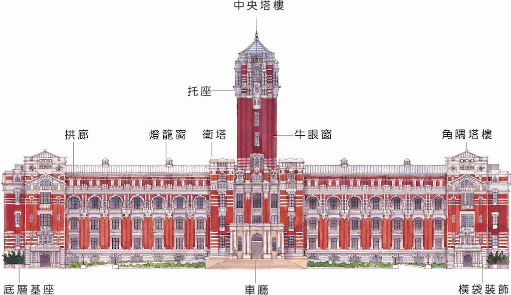 總統府的中央高塔高達60公尺(約20層樓高),典雅而華麗,是當年全台最高的建築,一直是台灣的地標,也是台灣近代史之化身。從高空往下看,平面為日字形,中央為敞廳典禮堂,四周為辦公室。