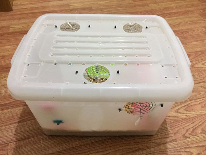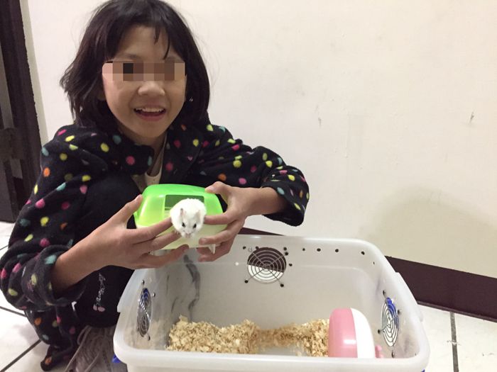 女孩利用整理箱為基礎,鑿孔讓四面牆都有通風設備,並設置餐碗、便盆、跑滾輪的位置,並在上方開口、方便泫泫與麻糬互動,這份飽含創意與愛的禮物,溫暖了麻糬與泫泫的心。