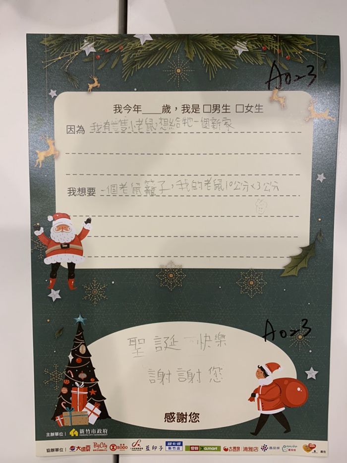 新竹市政府連續6年舉辦「心願卡」活動,由弱勢兒少許願,市府民眾同助圓夢,本次完成了450個孩子的圓夢禮物。其中,有位來自單親家庭的12歲女孩泫泫(化名)由曾祖母帶大,曾祖母去世後泫泫陷入低潮,爸爸帶來小倉鼠陪伴她,但又因經濟限制無法布置寵物窩,另一位12歲小女孩決定親手製作「倉鼠小窩」為她圓夢,終於讓泫泫重拾歡笑。