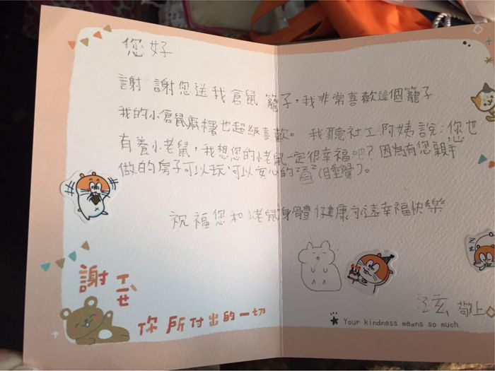 直到去(109)年11月,泫泫向社工表示:「麻糬陪伴我2年,曾祖母離開、爸爸去上班的時候,都是麻糬陪我,我要把心願卡禮物讓給麻糬。」於是,泫泫在心願卡寫下:「希望我養的小倉鼠有一個窩。」這個心願一個月後被市民神手大大的滿足,讓收到禮物的泫泫開心不已!