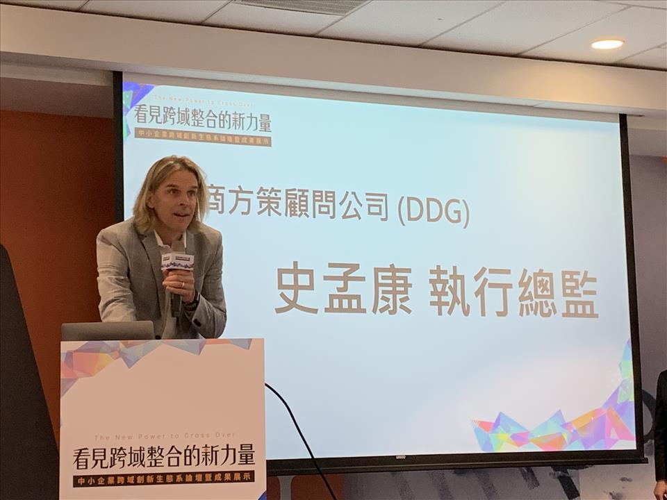 這次「中小企業跨域創新生態系論壇暨成果展示」來了一位金髮碧眼的外國人,卻說著一口流利的中文。他是史夢康,在台灣生活了十四年。從1992年來台灣,94年成立了品牌顧問公司,主要幫助台灣企業建立品牌,曾幫助過如捷安特、華碩等大廠。