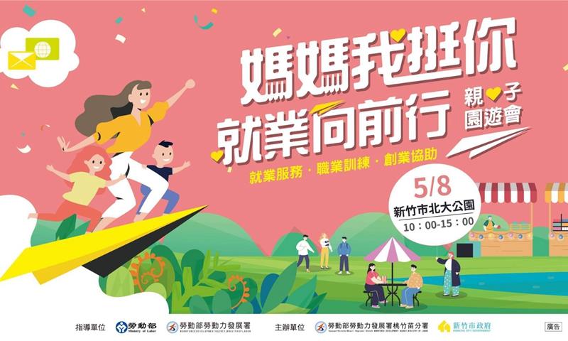 為歡慶母親節,由勞動部勞動力發展署桃竹苗分署與新竹市政府共同辦理「媽媽我挺你就業向前行」親子園遊會活動,將於本週末5/8(六)10:00-15:00於新竹市北大公園盛大舉辦,現場規劃超過40個主題攤位,包含創意手作商品及趣味職能力體驗,展現桃竹苗分署婦女職訓及就業服務成果!藉由攤位及體驗方式,提供婦女朋友就業服務相關協助措施,讓媽媽們能夠在家人的支持與陪伴下,一起邁向進入職場的挑戰。