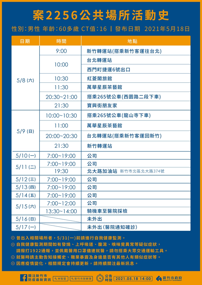 新竹市流行疫情指揮中心指揮官林智堅市長,今日透過記者會說明,依據今中央流行疫情指揮中心公布,新竹市新增一名COVID-19確診個案,案2256,為一名60多歲男性,經疫調,該案5月8日曾至萬華地區活動,並於5月15日自主採檢,17日確診(Ct值16),目前已擴大匡列接觸者,並已針對其足跡場所完成消毒。他呼籲,如果有到過中央公布確診個案的足跡場所,請做好自我健康監測,有症狀請打1922通報。