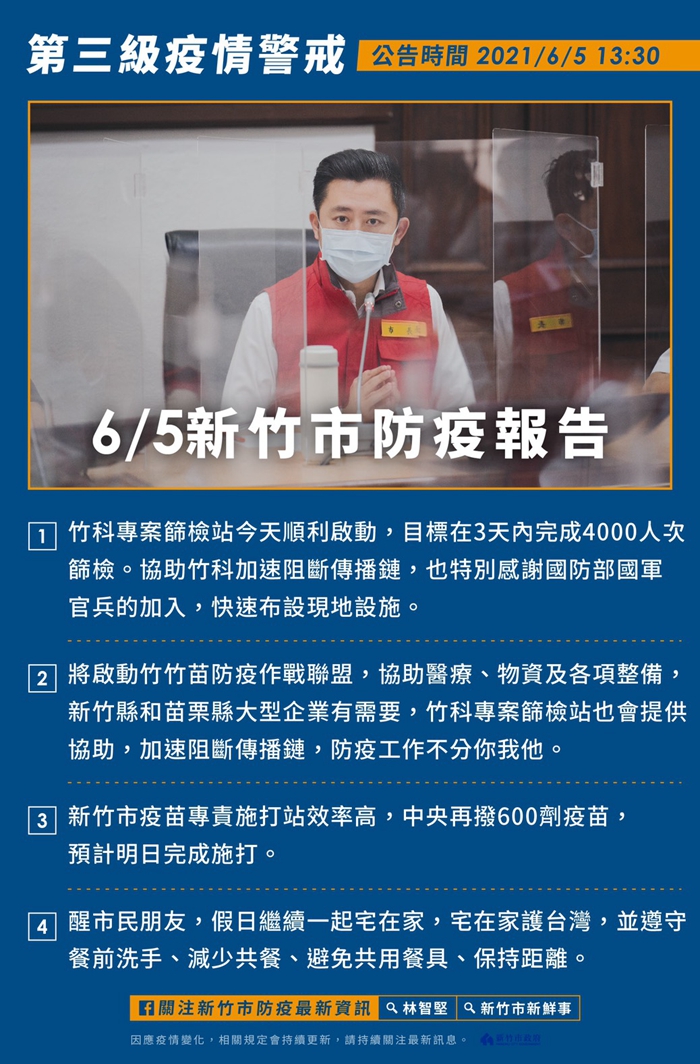 「大家生活在同一塊土地,不分你我他」,林智堅市長也指出,蔡英文總統也賦予他任務,除應全力協助科技部科管局的防疫,也依總統指示,組成「竹竹苗防疫作戰聯盟」,他已與新竹縣長楊文科、苗栗縣長徐耀昌縣長聯繫,彼此有高度共識、同舟共濟,以「區域聯防、醫療資源共享」原則,全力協助新竹縣、苗栗縣防疫工作。