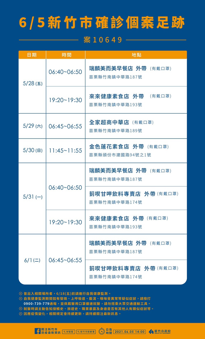 5月31日6時40分至6時50分曾到過苗栗竹南中華路上瑞麟美而美早餐店、竹南中華路菿喫甘呷飲料專賣店,19時20分至19時30分,曾到過竹南中華路來來健康素食店。