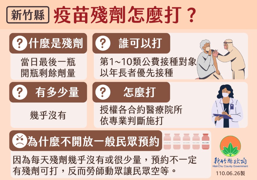 楊文科說明,中央宣布開放18歲以上成人預約候補接種疫苗殘劑,有不少民眾誤解,以為只要預約登記,就能打到疫苗。他指出,所謂的殘劑,是指打疫苗當天,最後一瓶打開的疫苗剩餘劑量,這個量幾乎是沒有,因為大多都能充分打完。由於剩餘劑量幾乎沒有,且預約後不一定有得打,反而將勞師動眾讓民眾空等,因此新竹縣疫苗殘劑將秉持不浪費的原則,授權各合約醫療院所,當遇到有殘劑狀況時,直接依專業判斷,提供給1至10類對象施打。