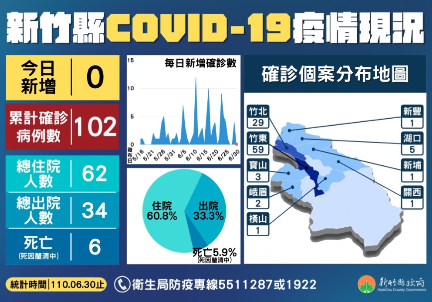 新竹縣今天(30日)沒有新增新冠肺炎確診案例,目前累積病例維持102例,住院隔離治療為62人,已康復出院為34人,死亡則為6人。新竹縣確診案例以機構群聚最多,佔64.7%,其次為家庭群聚佔24.5%,兩者佔比達9成。