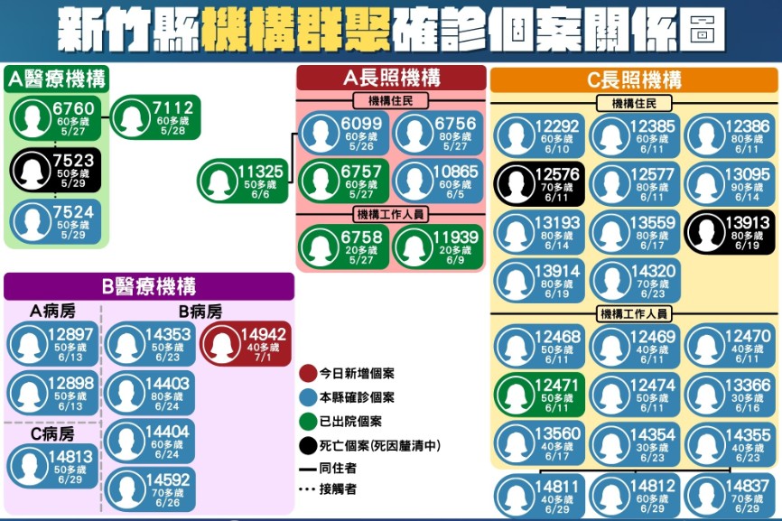 新竹縣今天(1日)新增1例新冠肺炎確診案例,為案14942,越南籍40多歲女性,住竹東鎮,是B醫療機構B病房的照服員,6月21日因案14353照服員請假,代為照護案14403。當案14403確診後,被匡列為居家隔離及採檢,當時採檢陰性,於院內1人1室居隔,30日配合疫情監測再採檢,結果陽性確診,收治專責病房隔離治療。該病房日前已列警戒紅區,全面擴大匡列,因此不再重複匡列,個案6月22日後均在院內居隔,無公共場所活動史。