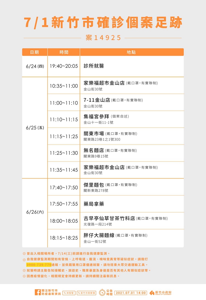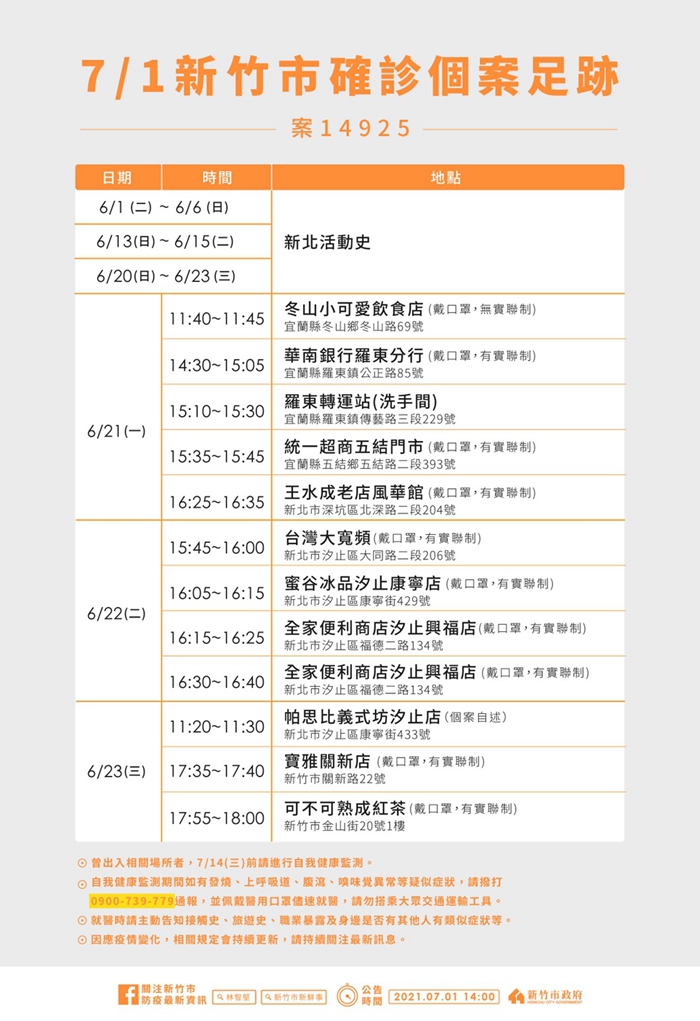 林智堅市長表示,案14925目前匡列新竹同住室友2人、公司同事3人、男友及男友家人5人、宜蘭家人3人,共13人居家隔離,目前PCR一採11人為陰性、2人等待採檢結果。其足跡表請參考附圖,相關場所全面消毒進行中。