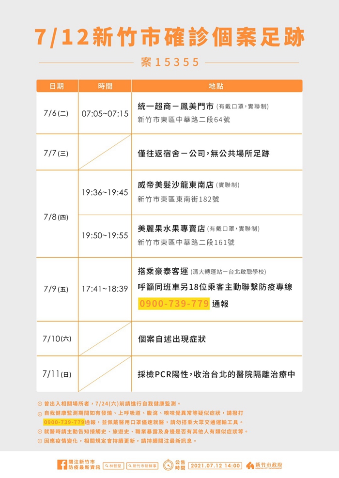 林智堅市長表示,案15355公司位於新竹縣,居住位於新竹市的公司宿舍,目前宿舍人員已進行全面篩檢。假日期間,該案往返台北市,7月10日出現輕症就醫採檢確診,已匡列相關接觸者18人居家隔離,其中13人一採陰性,5人等待結果中。相關公共場所足跡可參考附表。