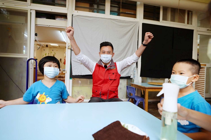 林智堅市長今與學童們一同洗手、消毒桌面。看見市長,大班學童們分享說,「很開心可以回來上課」。