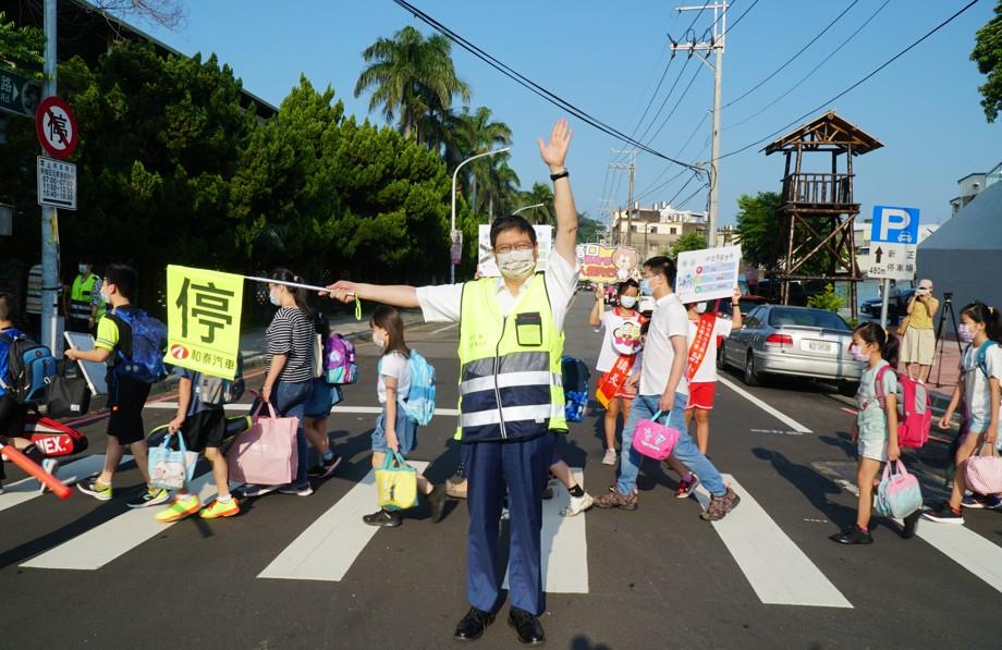 9月1日實體開學首日,楊文科縣長清早穿著反光背心、手持指揮旗,化身導護志工在中山國小護送學童上學,並藉機宣導「行人停看聽」、駕駛人「路口慢看停」,希望大家攜手打造交通安全環境。楊縣長還檢視通學步道使用狀況並關切校園防疫,還進行犯罪預防宣導,希望新竹縣每一位學子都能在安全的環境成長學習!