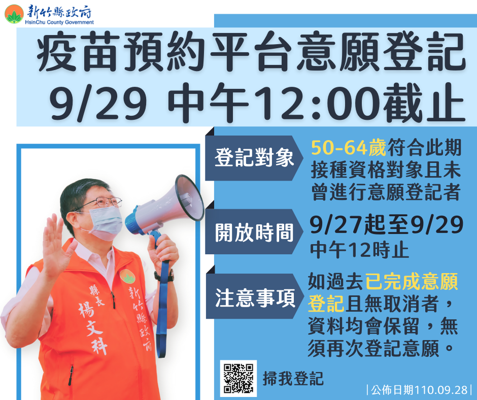 新竹縣長楊文科再次提醒,50-64歲者若接種第1劑AZ疫苗時,不是透過平台登記施打者,呼籲在9月29中午12時前務必要上平台意願登記。國內疫情雖趨緩,目前仍在中秋節連假2週觀察期內,9月21日至10月4日維持疫情警戒第二級,防疫不能鬆懈,請鄉親們繼續保持「打疫苗、戴口罩、勤洗手、社交距離」,共同養成防疫新生活態度。