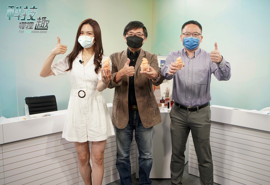 工研院自製的網路節目《科技哪裡趣》第一集聚焦「吃冰淇淋拚減碳?!《工研院x台泥》的碳循環綠經濟!」左起主持人朱楚文、台灣水泥研究室經理章興國、工研院綠能所副組長廖啟雯。