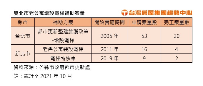 台北市推行的「都市更新整建維護政策」,提供增設電梯、外牆整新修繕、結構補強等補助,其中增設電梯補助,最高補助220萬元,從2005年截至今年10月,已收到53案申請,其中有20案已完工。新北市也分別在2011年2019年推出「老舊公寓裝設電梯」和「電梯特快車」補助方案,最高可獲得320萬元補助,截至目前為止,該方案有25案申請、已有6案完工。