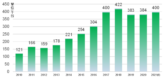 2010~2021年全球工業機器人的裝置量 資料來源: IFR,工研院產科所(2021/09)