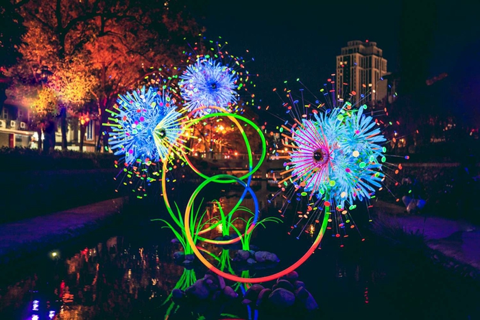 城銷處說明,護城河靜態燈區共有4件作品,除「奇幻花園」、「逐光飛翔」之外,先前已登場的「風.光.逐夢」、「光電獸#23巡跡掃描」,展期至11月27日,其中「風.光.逐夢」作品出自新竹子弟蔡筱淇,旅英22年的她,與日本籍丈夫吉川公野搭檔創作,以不鏽鋼、鋁合金呈現出「風吹」的自然線條,創作宛如「凝結煙火」綻放在河面。