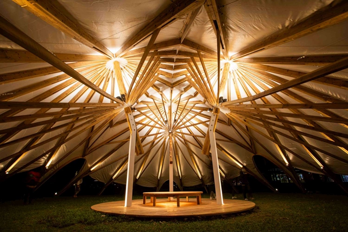 客家燈區「落水唷」作品由藝術家范承宗將象徵緣分與圓滿的客家「油紙傘」解構、複製與重組,打造一頂大型戶外帳篷,展期至11月27日
