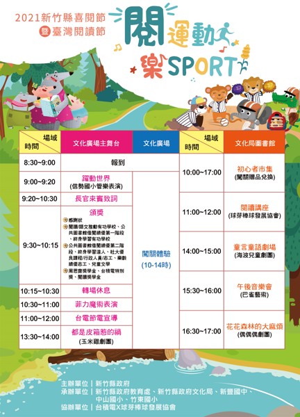 新竹縣2021「喜閱節暨終身學習博覽會X台灣閱讀節」將於12月11日9時至17時在文化局文化廣場隆重登場,本次活動主題為「運動文學」,邀請民眾參與運動文學闖關活動,並邀請玉米雞劇團、菲力表演家族演出,只要參加闖關就獲好禮加碼資格,將在12月21日在教育處臉書「風動新竹‧亮麗學習」抽出精美小禮品、職棒球星簽名球。