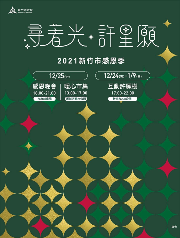 2021新竹市感恩季即將展開,今(110)年以「尋著光、許星願」為主題,精心設計的「暖科技互動聖誕樹」,將在12/24日晚間點亮228公園廣場,12/25日周末午後護城河畔超過百家暖心手作市集,以及當天晚上在市府前廣場的「聖誕感恩晚會」,將邀請溫暖派女聲魏如萱、金曲歌王蛋堡以及演歌雙棲全方位藝人盧廣仲等人,唯一獻唱最暖歌聲送給新竹市民幸福的聖誕夜!