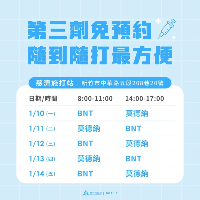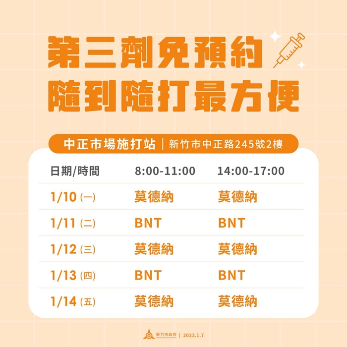 衛生局說明,中正市場 (新竹市中正路245號2樓) 、體育館施打站(新竹市公園路295號)、慈濟施打站(新竹市中華路五段208巷20號)10日起至14日,每日8點至11點、14點至17點,依時段提供莫德納、BNT疫苗,民眾免排隊,隨到隨打,三座疫苗站不提供打疫苗送禮券活動。