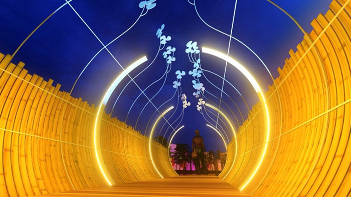 看完了「虎掌」來找「虎紋」,擅長動力機械的「穀米機工」,以老虎黃、白、黑的斑紋發想,設計出燈光雕塑「徹夜未眠直至晨光」。每當九降風吹起,燈光雕塑圓環將自動轉動,交錯甩動時,宛如老虎跳耀護城河。