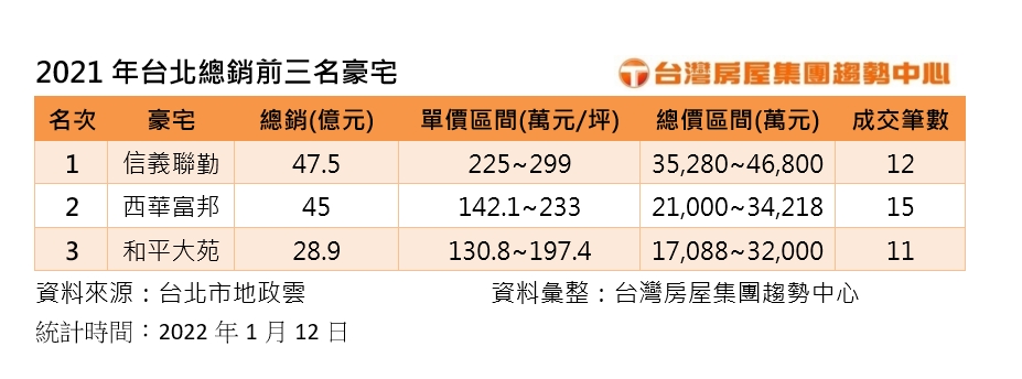 張旭嵐指出,2021年北市豪宅交易前三名,單價都有出現200萬元行情,且幾乎平均每一個月就成交一戶,反映市場資金豐沛,在中美貿易戰疫情、等因素,讓台商及原本在國外留學或工作的人回台,有長期的居住需求,且全球疫情尚未止息、通貨膨脹等影響,導致流向不動產的資金明顯增加。