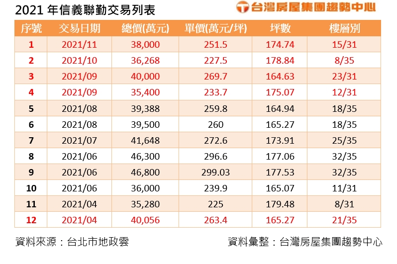 台灣房屋集團趨勢中心執行長張旭嵐表示,「One Park Taipei信義聯勤」享有大安森林公園萬坪景觀,永久棟距吸引富豪收藏,分南北兩棟,揭露至今每筆單價都超過200萬,穩居2百萬俱樂部,該社區20樓以上高樓層成交價落在260萬元以上,且32樓戶創下最高單價達299萬元,奪下年度最高單價台北豪宅王。