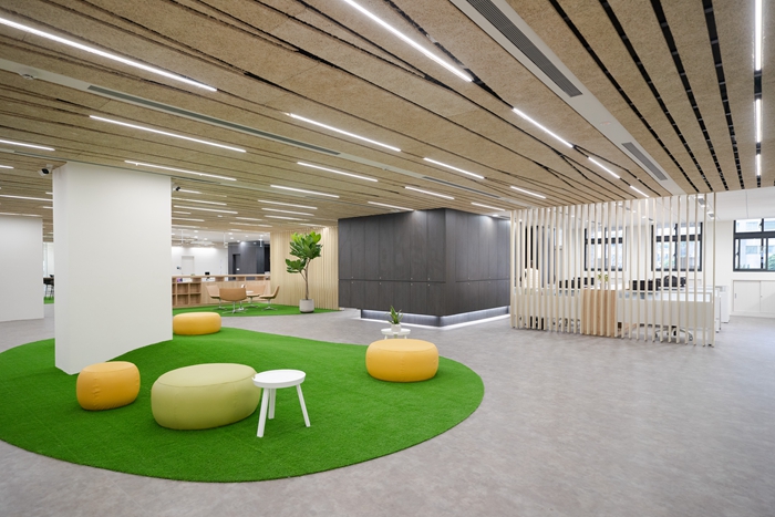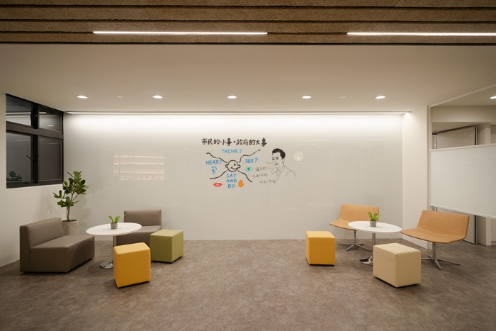 2樓整體設計跳脫以往辦公室嚴肅氣息,以米、黃、綠、卡其等大地色系點綴,並設置迎客生活吧檯、沙發區、青年新創與公益產品陳列區,提供民眾自由交流討論,因全新大樓位於新竹科學園區門口龍山西路上,這些公共交流空間與會議空間可供企業使用、還可媒合園區職缺。