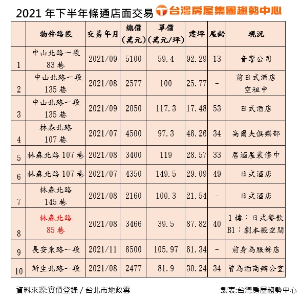 觀察這十筆店面交易,有五筆仍掛有日式酒店招牌,有一間音響公司持續經營中,有一間店面正由居酒屋接手裝修中。至於林森北路85巷店面,去年8月以3466萬轉手,看似單價不到40萬,不過主要因為店面包含地下室,因此單價較低。新買家為登記在台東的投資公司,低價卡位條通商圈,目前一樓由日式餐飲店營業中,地下室則是開設劇本殺遊戲空間,有別於過往的燈紅酒綠,為商圈帶來新貌。