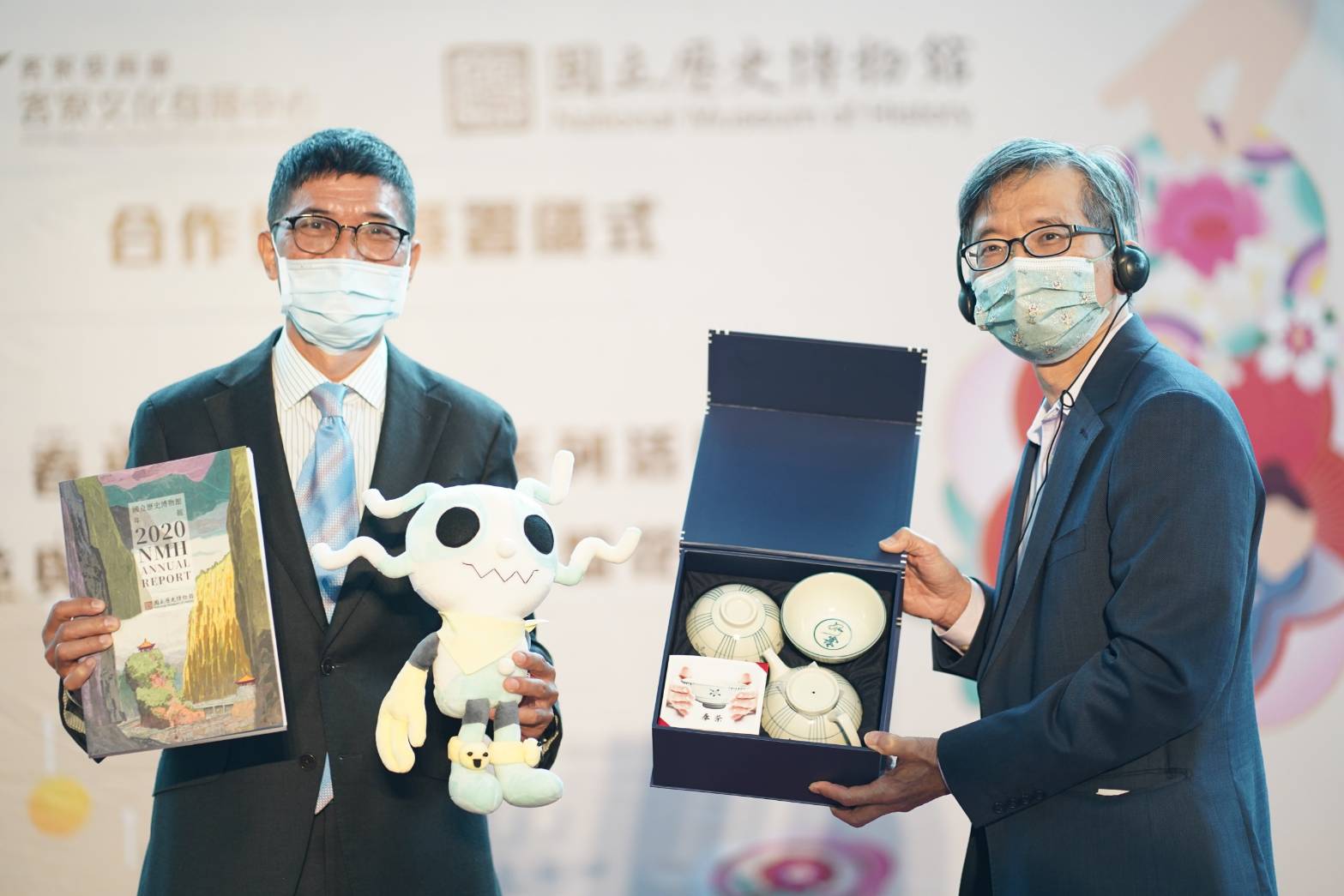 客家委員會客家文化發展中心何金樑主任與國立歷史博物館廖新田館長雙方致贈紀念品