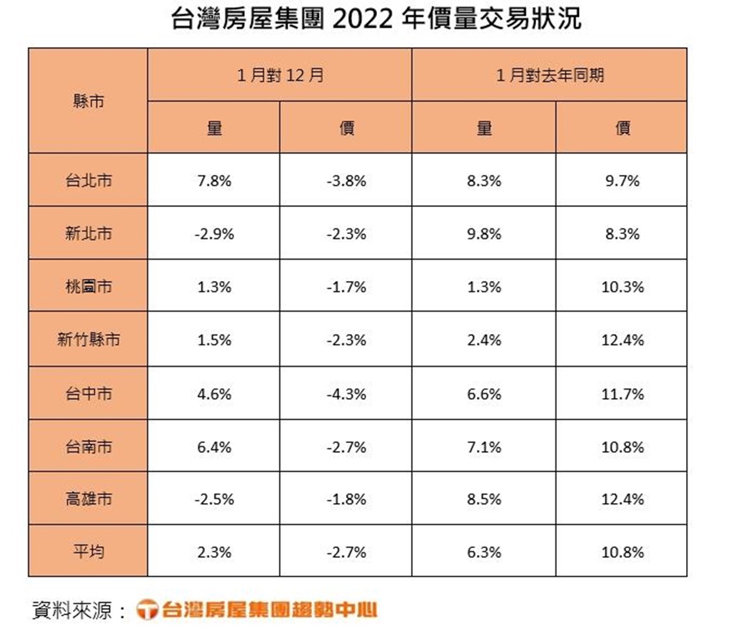 台灣房屋集團統計內部成交行情,觀察2022年1月價量變化,七都交易量對去年12月小幅增長,平均小漲2.3%,月跌2.7%,不過和去年同期相較,交易量年增6.3%,價年增10.8%。