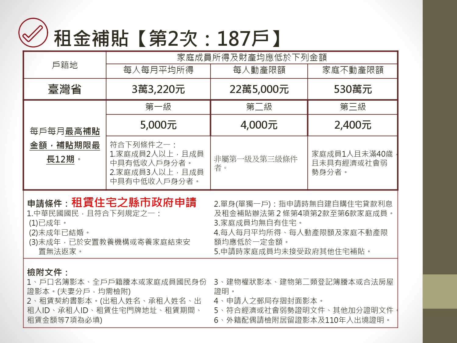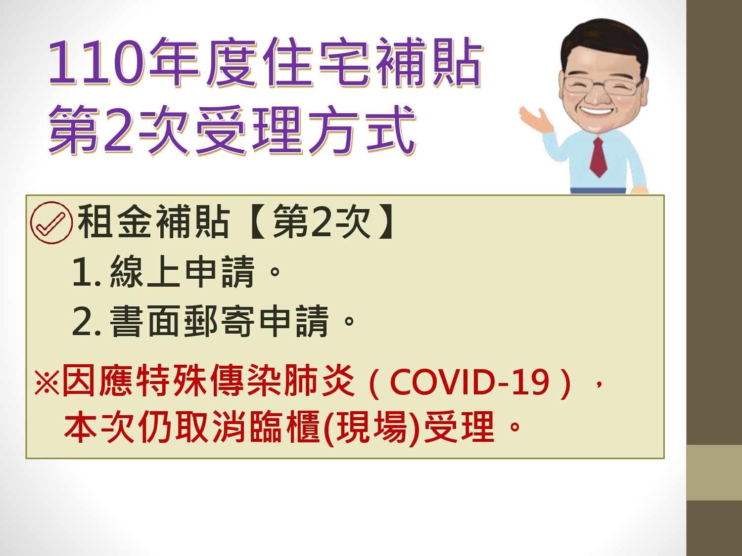 新竹縣租屋的鄉親請注意,110年度住宅租金補貼第2次受理申請將從111年2月14日起至111年2月25日止,因應疫情採線上及郵寄方式受理,補貼期間為12個月,新竹縣分3級補貼,每月最高補貼租金5,000元,名額共187戶,新竹縣長楊文科呼籲符合資格的租屋客盡速來申請,以減輕疫情下的負擔。