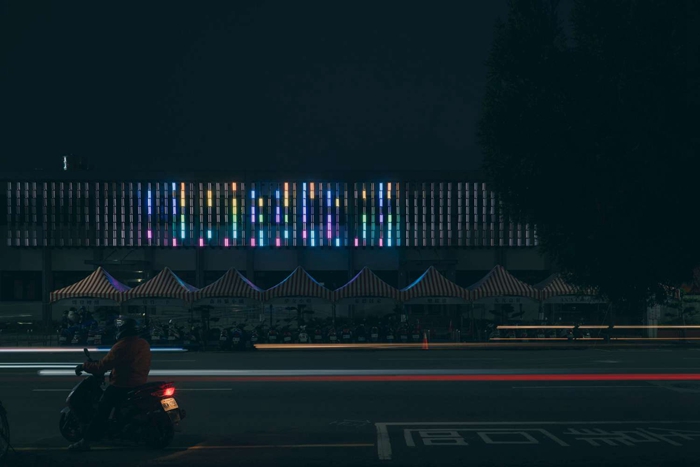 台電新竹區營業處活動中心過去是K書中心,老舊立面如今重生,全新裝置藝術《風乘著光》以「竹篾」及「螺鈿」發想,即時擷取氣象資訊,捕捉風的軌跡,邀請民眾線上「點光」,寫下心願一同照片新竹夜空,藉由摩斯密碼的形式呈現,心願不再害羞被人看見。