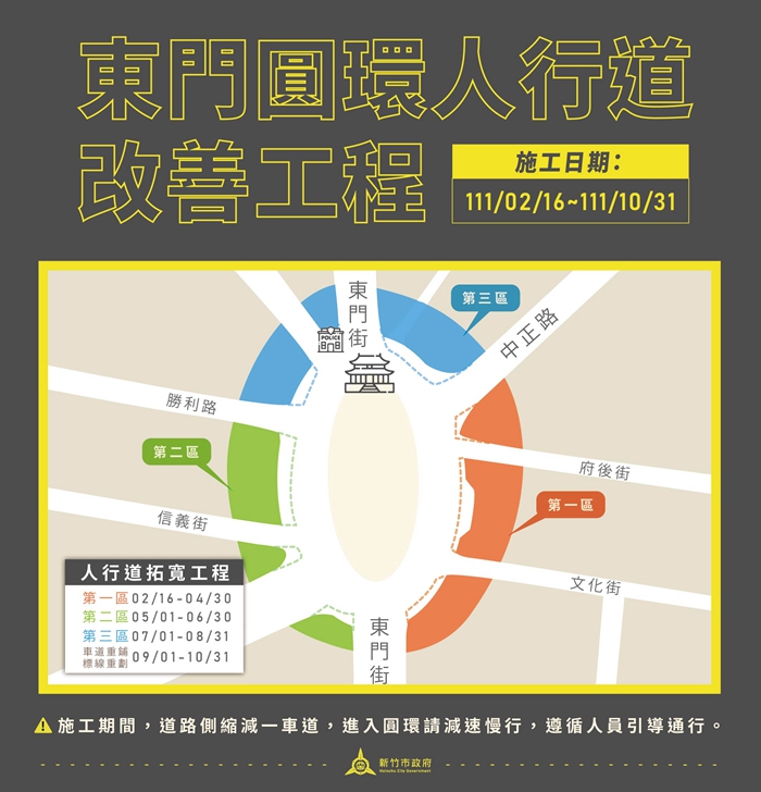 新竹市長林智堅表示,市府本次投入4100萬元進行東門圓環二期改善工程,有四大重點。第一,拓寬人行道並改善鋪面破損,人行道將從5米拓寬至9米;第二,經交通車流評估,圓環車道將由五線道改為四線道,內三車道寬度為標準3米5汽車道,最外圈第四車道則為5米混合車道,並將行穿線退縮、新設無障礙斜坡道、調整道路線型讓車流更加順暢。