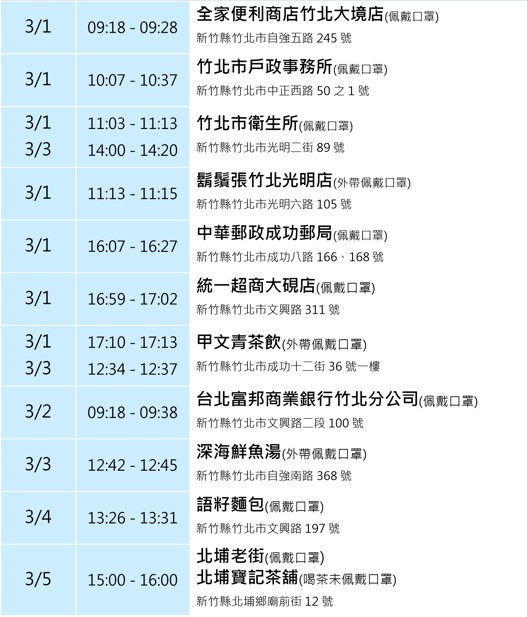 案20964於新竹縣公共場所活動史包括:3/1(二)竹北市有7處活動足跡,包含購物、戶政事務所及衛生所業務;3/2(三)竹北市1處活動足跡在銀行辦理業務;3/3(四)竹北市3處足跡有購物及衛生所打疫苗;3/4(五)竹北市1處足跡外出採購;3/5(六)北埔老街逛商圈及茶舖共2處。以上場所均由清潔隊完成環境消毒。