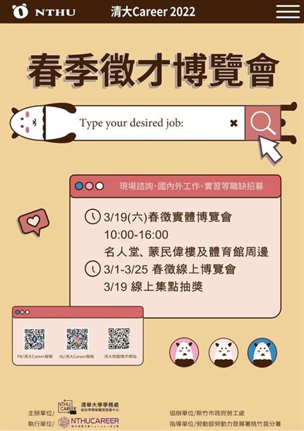 勞工處表示,2022年清大career春季徵才實體博覽會,將於3月19日(星期六)上午10時至下午4時,於清華大學名人堂、蒙民偉樓及體育館周邊舉辦,當天勞動部勞動力發展署、新竹市政府勞工處、新竹就業中心及賈桃樂主題館都會在現場設攤,未來還有3場次的校園就業博覽會,分別將在3月31日元培科大、4月26日中華大學、玄奘大學接力舉行,歡迎青年朋友踴躍參加。