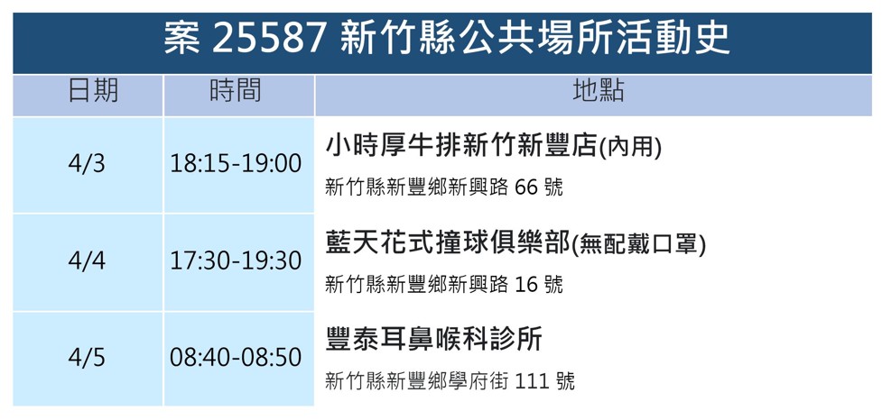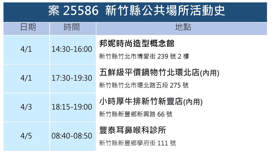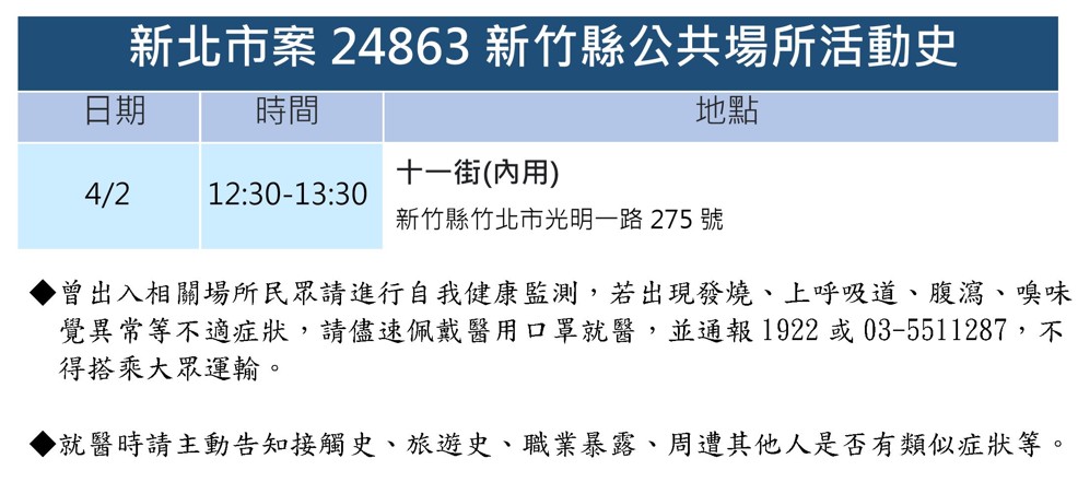 新北市確診者案24863曾在發病前2天到過新竹縣竹北市,已通報消毒、疫調、匡列,並透過實聯制以簡訊通知民眾加強自我健康監測,有症狀者請至醫院採檢。