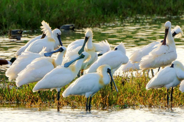 黑面琵鷺換上金色繁殖羽來到金城湖停棲