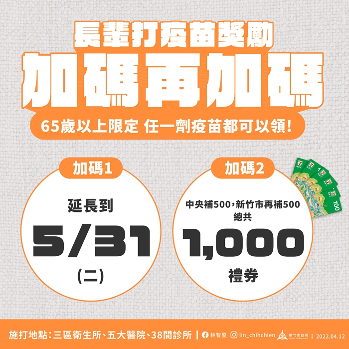 市府也宣布,為鼓勵長輩施打疫苗,市府加碼贈禮券,凡設籍新竹市滿65歲以上長輩,明(13)日起接種任何一劑疫苗,除可領取中央500元超商禮券外,竹市再加碼發放500元超商禮券,5月底前接種完成,共可領1000元禮券。