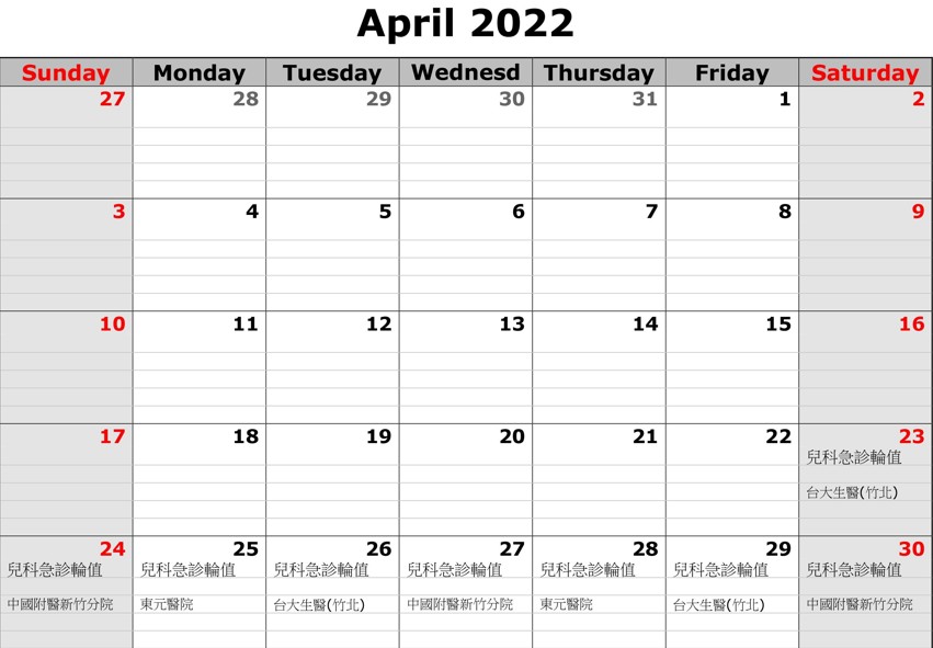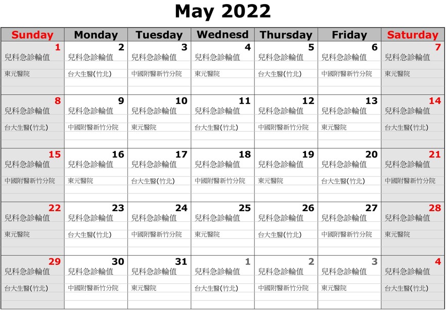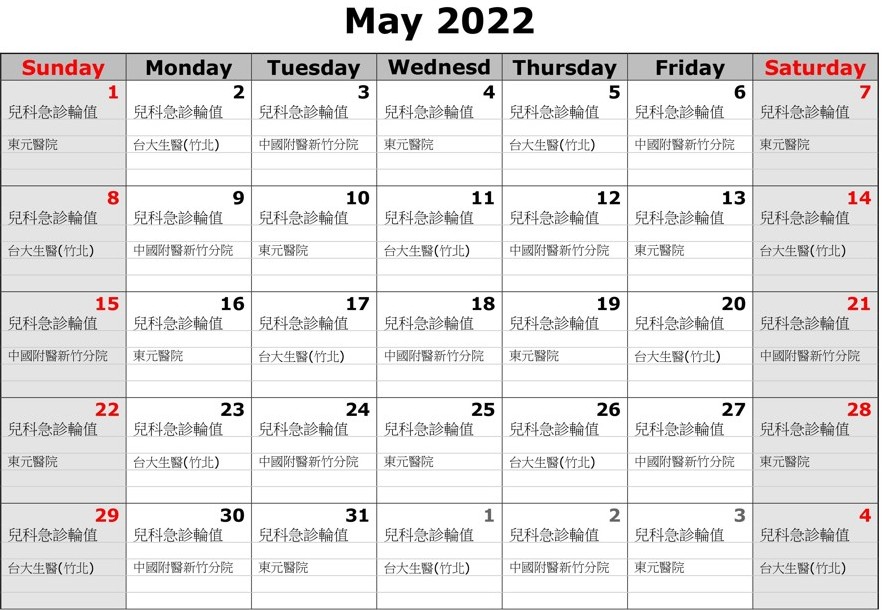 3間醫院輪值順序自4月23日起,由新竹臺大分院生醫醫院竹北院區、中國醫藥大學新竹分院、東元綜合醫院依序輪值。若兒童、幼兒出現發燒超過48小時或高燒39度C以上合併發冷、冒冷汗,或是退燒後持續活動力不佳、退燒後仍持續呼吸急促、嘴或胸悶胸痛,或持續嘔吐、頭痛、腹痛,或超過12小時未解尿、未進食,請盡速諮詢醫療團隊。
