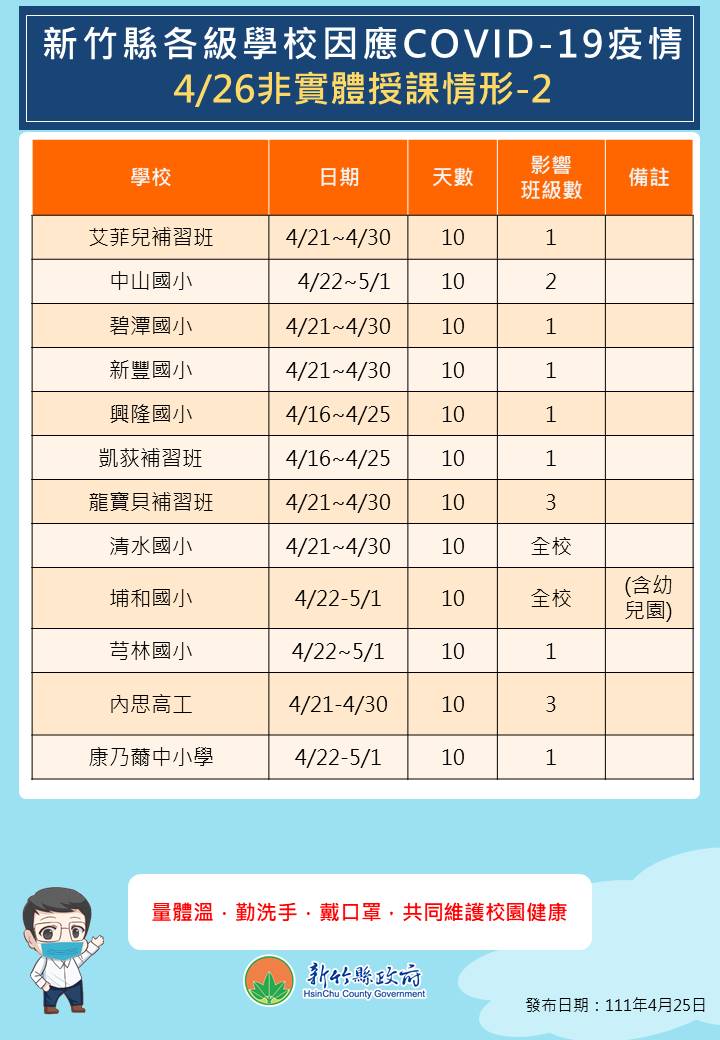 ◆芎林國小/1名學生確診,該班自4/22(五)至5/1(日)暫停實體授課10天,5/2(一)復課。