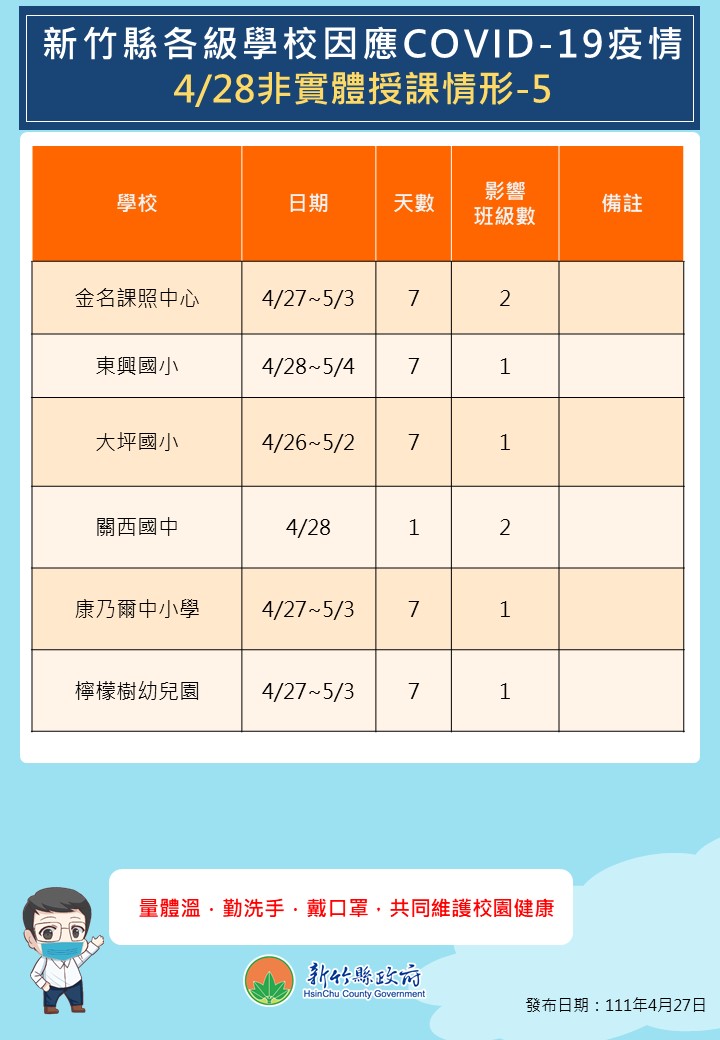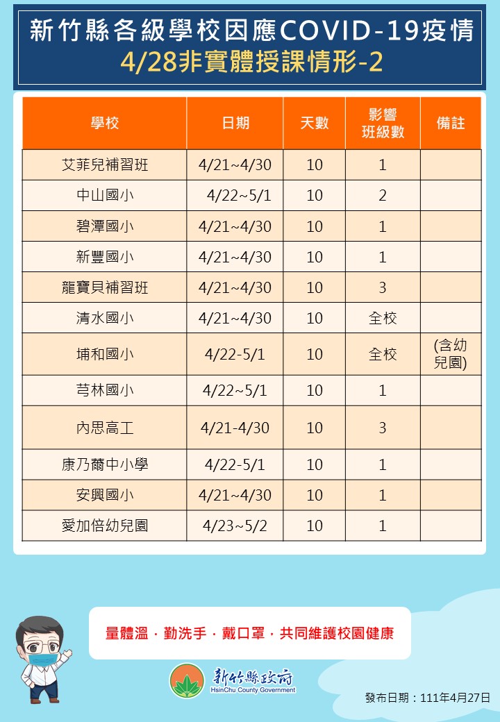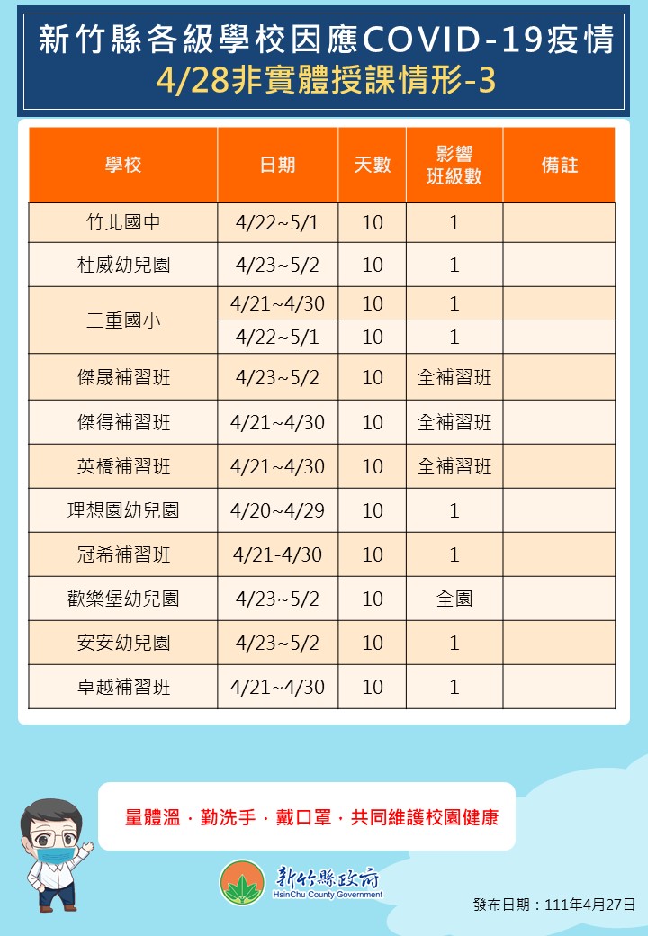 暫停實體授課的學校新增關西鎮關西國中、竹北市東興國小、北埔鄉大坪國小、新埔鎮檸檬樹幼兒園,補習班則新增竹北市金名課照中心。竹北市康乃薾中小學新增一名學生確診,該班4/27(三)至5/3(二)暫停實體課程7天。