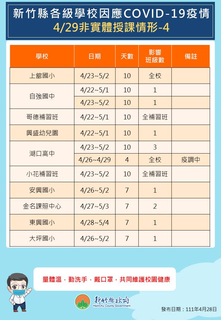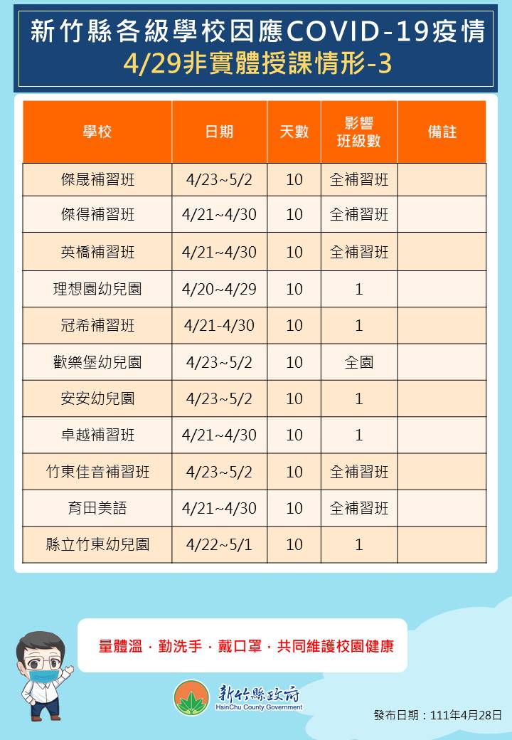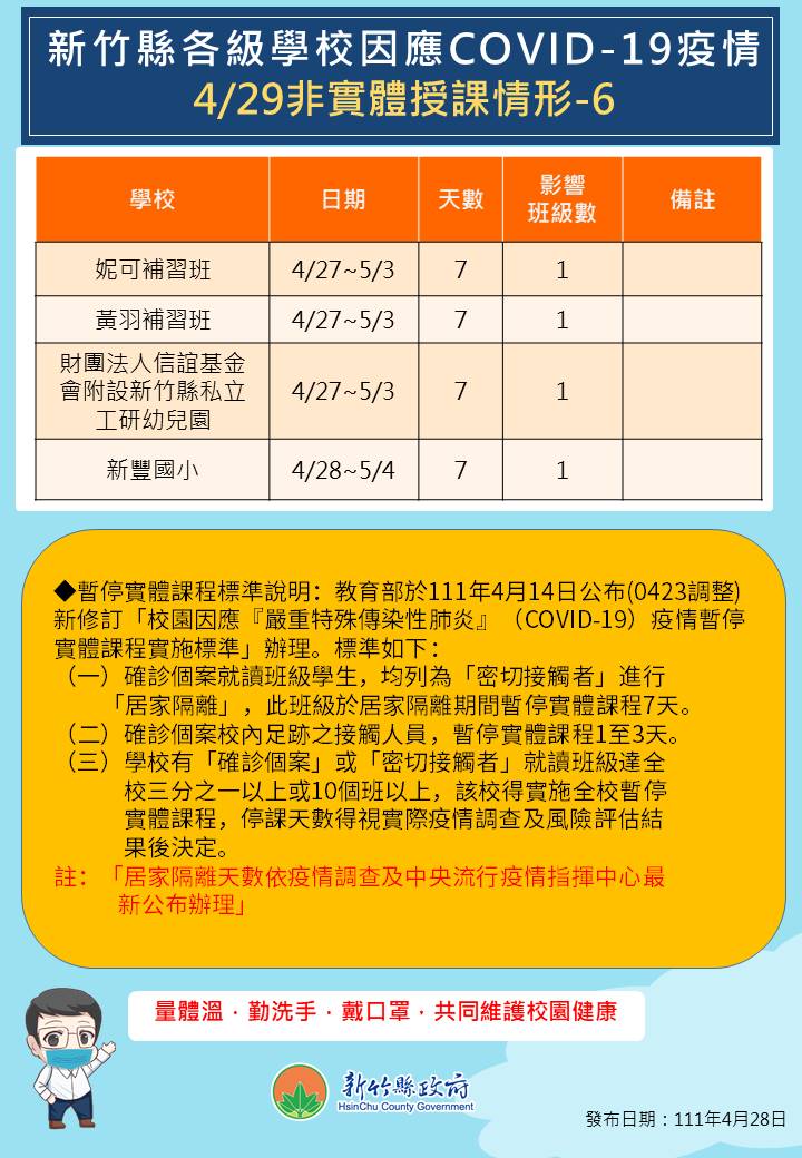 新竹縣4月29日暫停實體授課的學校新增竹北市十興國小、六家高中(高中部)、安興國小、道禾幼兒園,竹東鎮財團法人信誼基金會附設新竹縣私立工研幼兒園與道禾幼兒園,關西鎮關西國中與南和國小,新豐鄉新豐國小。補習班則新增竹北市妮可補習班、黃羽補習班。關西鎮關西國中昨為2名學生疑似確診,今(29日)確診,該2班將暫停實體授課7天。