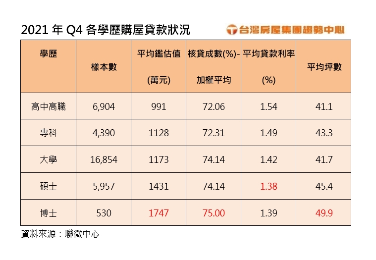 台灣房屋集團趨勢中心執行長張旭嵐表示,其實銀行評估貸款條件,並非單看學歷,主要評估貸款人的「還款能力」和「工作狀況」以及「房屋條件」,而高學歷者較有機會進入百大企業,其中博士生除了學校任教,或是高端的研究單位,若在公家機關工作,也有較好的升遷機會,獲得高薪的機會大,不僅財力累積得快,往來不乏社經地位較高的人士,對於住家條件要求也高,因此購買房屋的地段佳、總價高,相對鑑估值和貸款成數也比較漂亮。