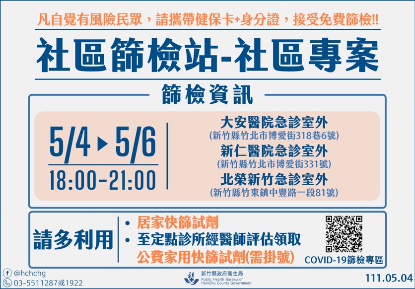 5/4週三1800-2100於竹北大安醫院急診室外、新仁醫院急診室外、竹東北榮新竹分院急診室外。