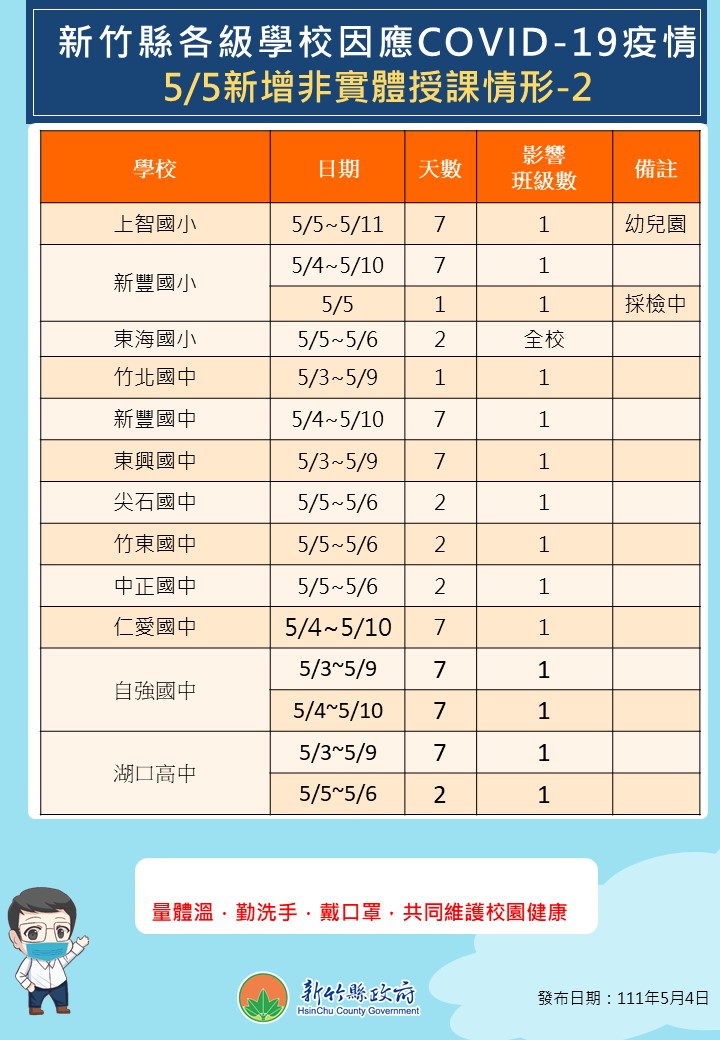 ◆竹北國中/1名學生確診,該班5/3(二)至5/9(一),暫停實體課程7天。(5/4下午新增)